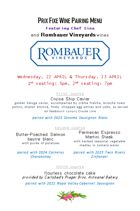 This will be an exceptional experience! Napatini will pair 3 fine dining courses with 3 exceptional wines from Rombauer Vineyards in Napa County. Price is $79 per person with wine pairing, plus 20% service/gratuity and tax.