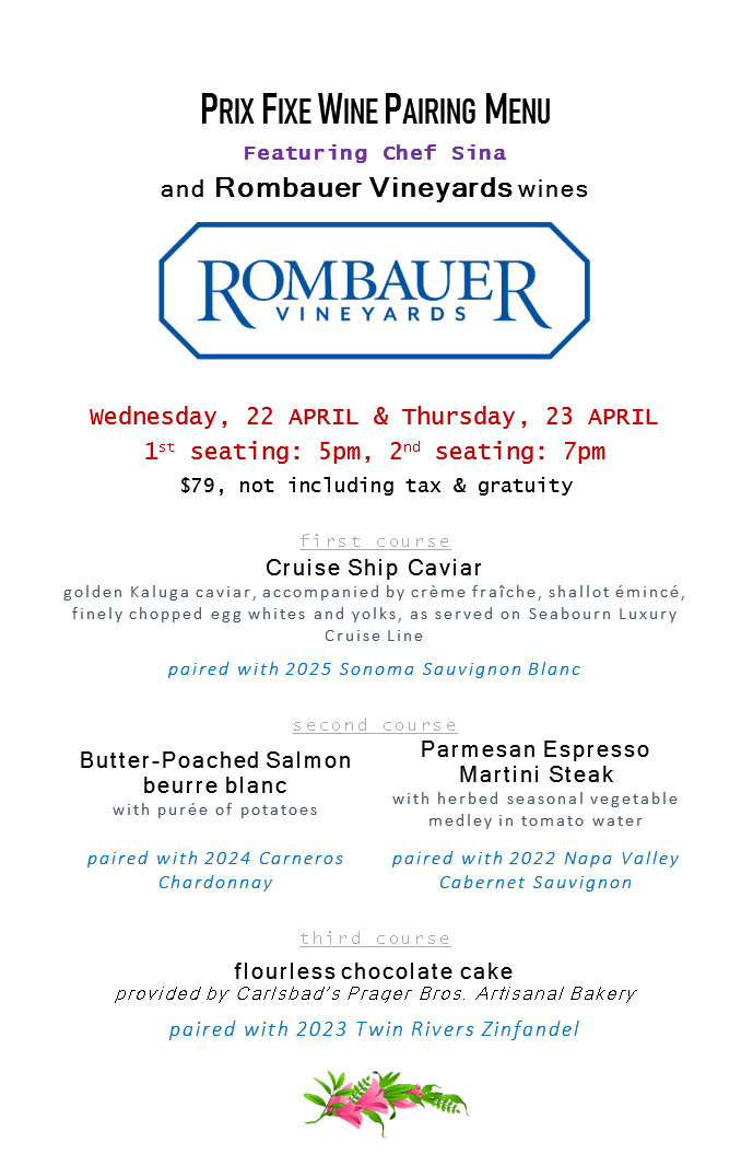 This will be an exceptional experience! Napatini will pair 3 fine dining courses with 3 exceptional wines from Rombauer Vineyards in Napa County. Price is $79 per person with wine pairing, plus 20% service/gratuity and tax.