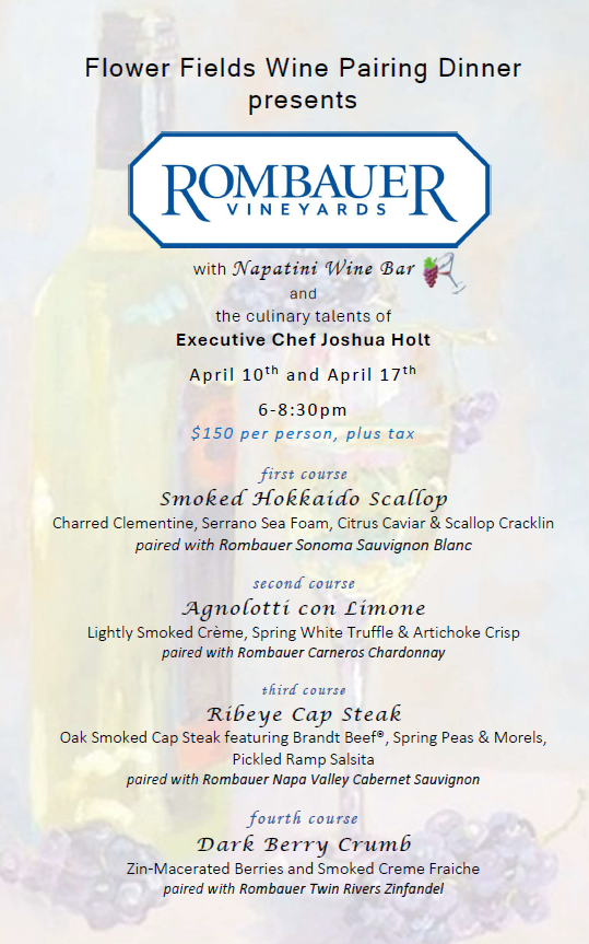 The Flower Fields, Chef Joshua Holt, and Napatini have created a gourmet dinner paired with our featured winery- Rombauer Wines, on both Friday, April 10 and Friday, April 17.